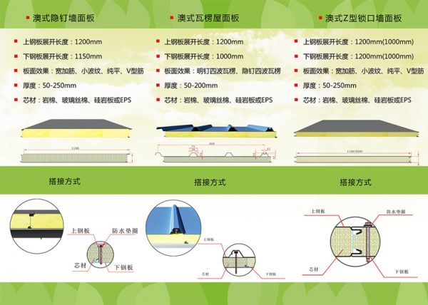 明钉搭接式墙面板搭接方式:隐钉插口式、Z型锁口式