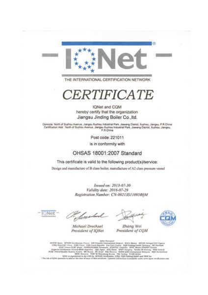 职业健康安全管理体系认证证书